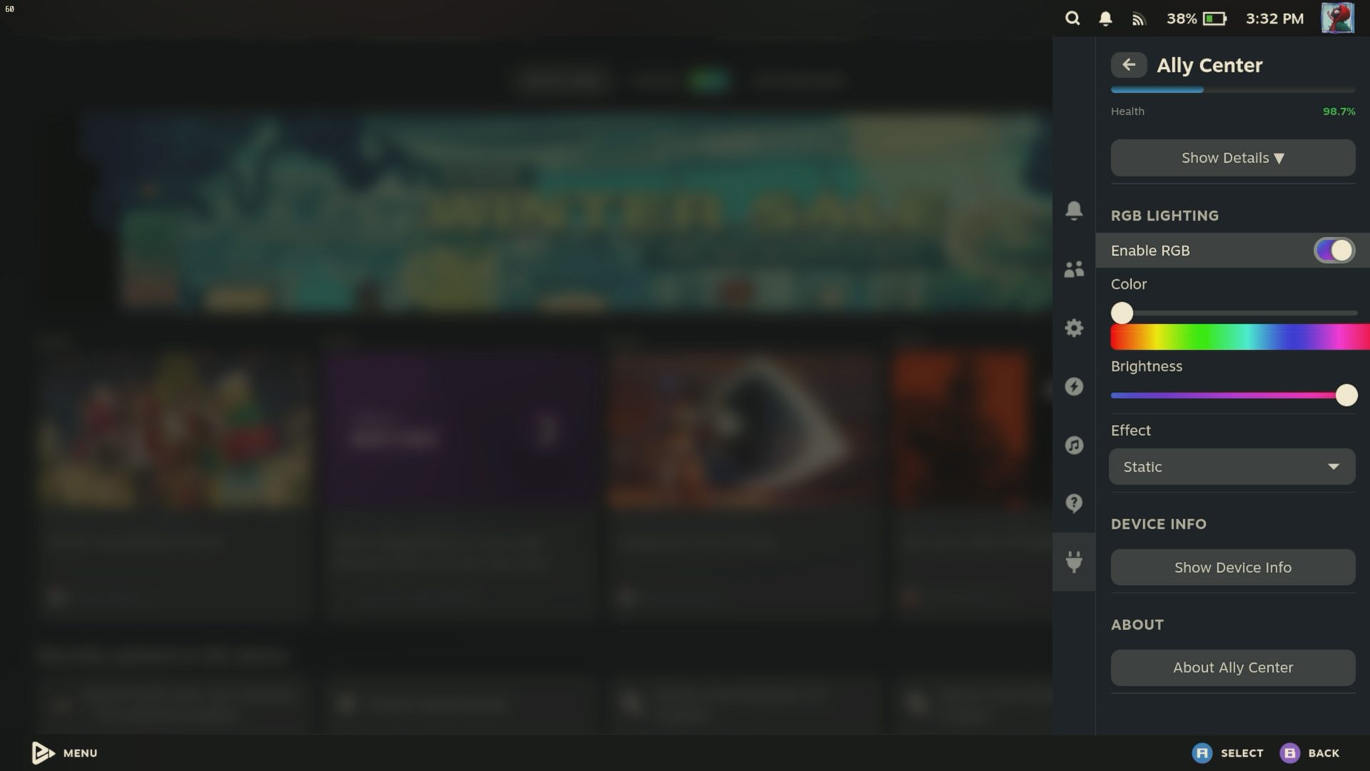 Por si fuera poco, también puedes controlar el brillo y los efectos de los anillos RGB de los sticks, pasando del modo arcoíris a uno estático o de respiración según te pille el cuerpo. También te escupe toda la información técnica del sistema, desde la versión de la BIOS hasta la del kernel, para que sepas exactamente qué está pasando en las tripas de tu consola en cada momento.