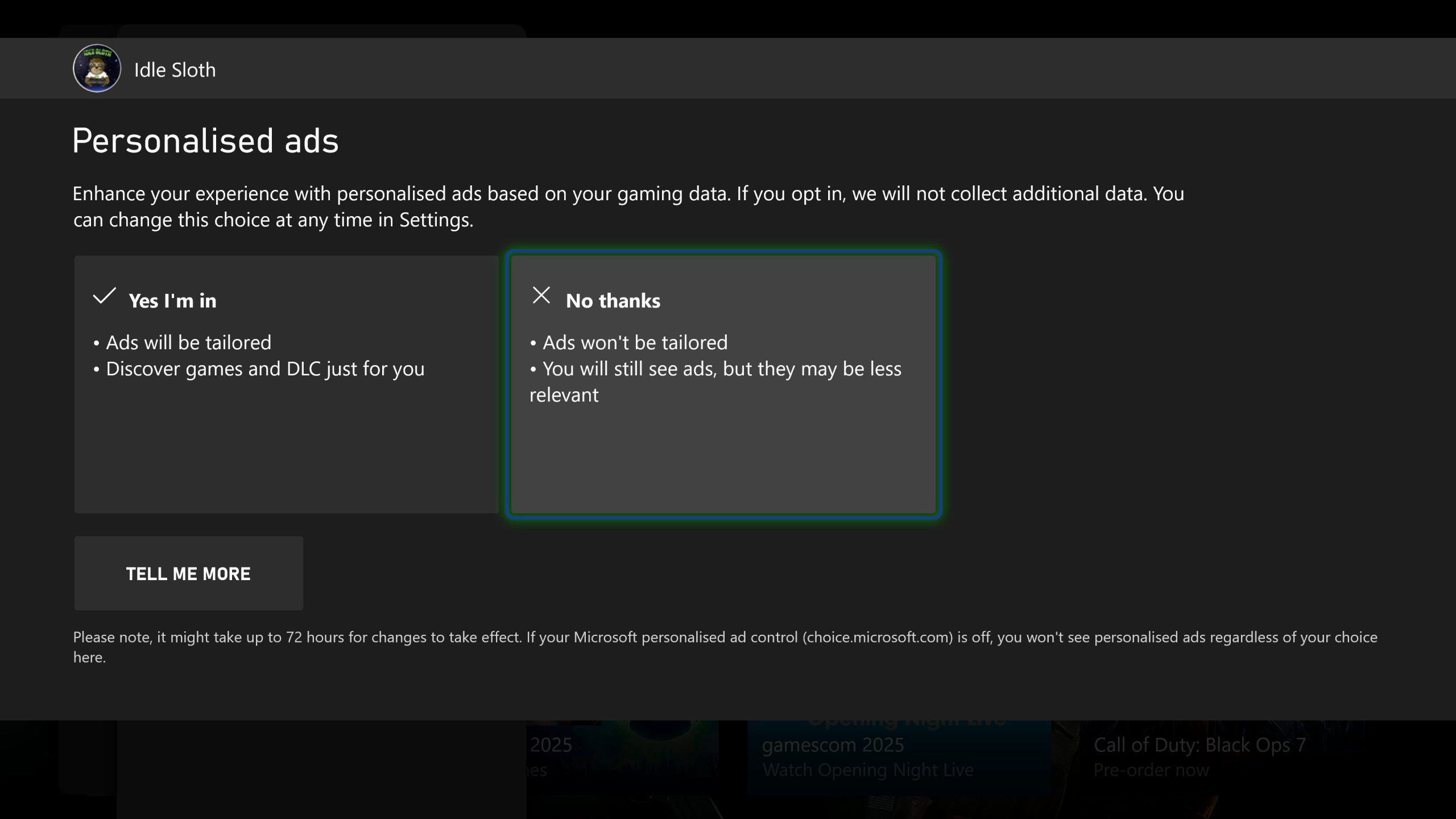 Al activarse, la opción presenta dos alternativas: «Sí, acepto» para recibir anuncios basados en su actividad en la plataforma, o «No, gracias» para mantener publicidad no personalizada. Los anuncios personalizados se generan a partir de datos como los juegos jugados, comprados o servicios utilizados, mientras que la opción de rechazo mantiene la publicidad, aunque con menor relevancia.