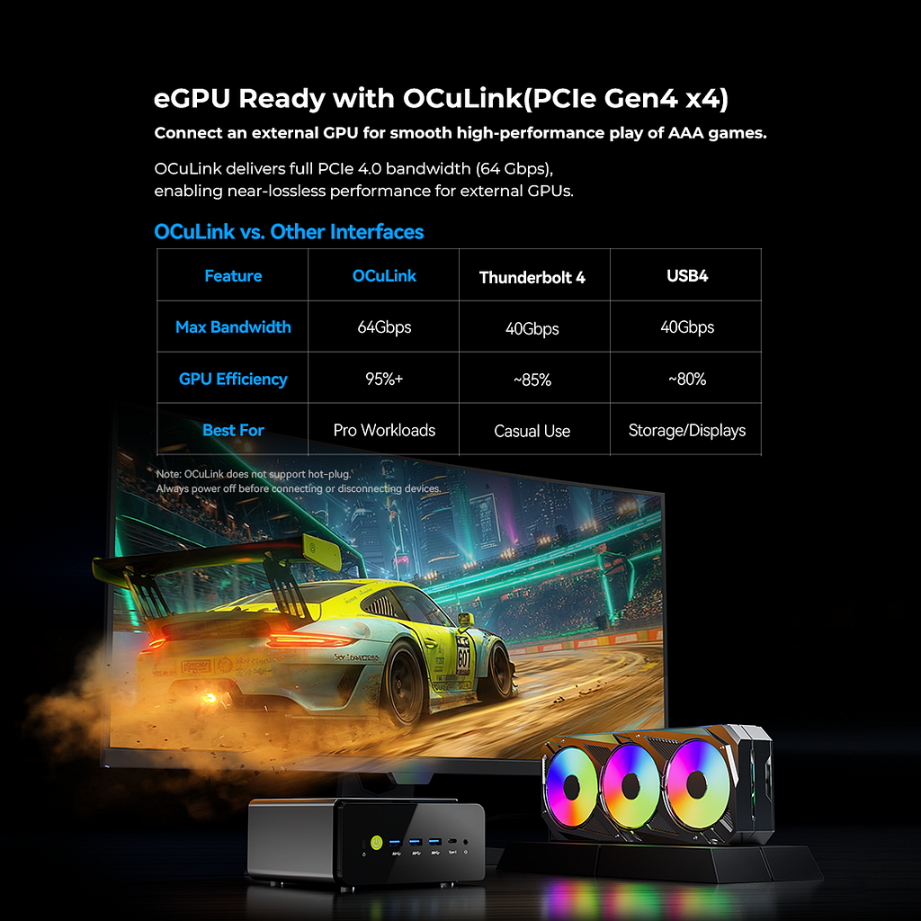 Lo que de verdad cambia las reglas del juego es que este pequeño dispositivo incluye un puerto Oculink. Esto es canela en rama, porque te permite conectarle una tarjeta gráfica externa de escritorio. Si le enchufas una buena GPU, el K15 se transforma en una bestia parda capaz de merendarse cualquier juego moderno, aprovechando además su memoria DDR5 a 5600 MT/s para que no haya cuellos de botella.