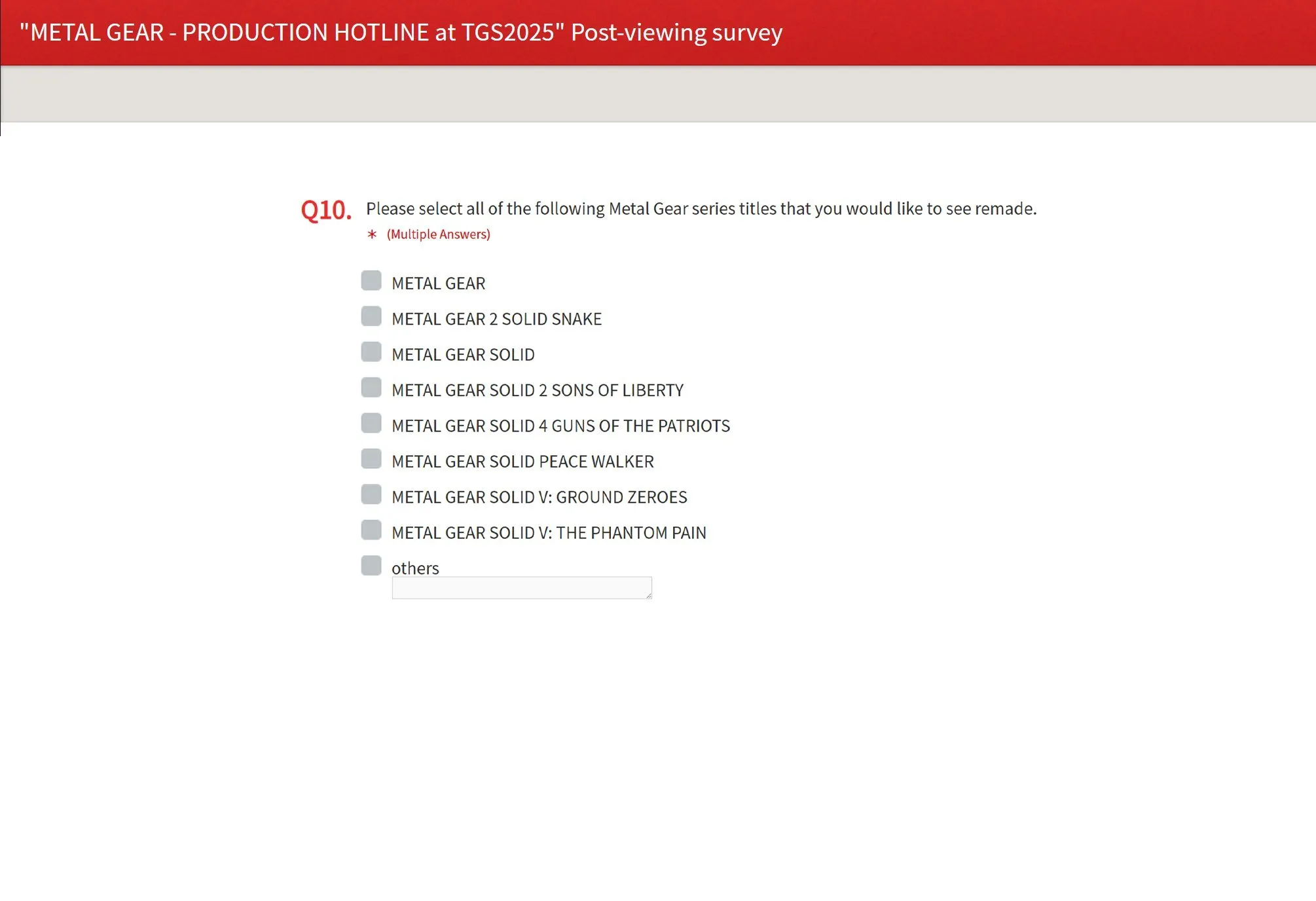Konami se prepara para lanzar una nueva encuesta tras su próxima transmisión de Metal Gear Production Hotline en el Tokyo Game Show 2025. La transmisión está programada para el 25 de septiembre y la encuesta estará disponible hasta el 9 de octubre. Inicialmente, la encuesta parece estar limitada al público japonés.