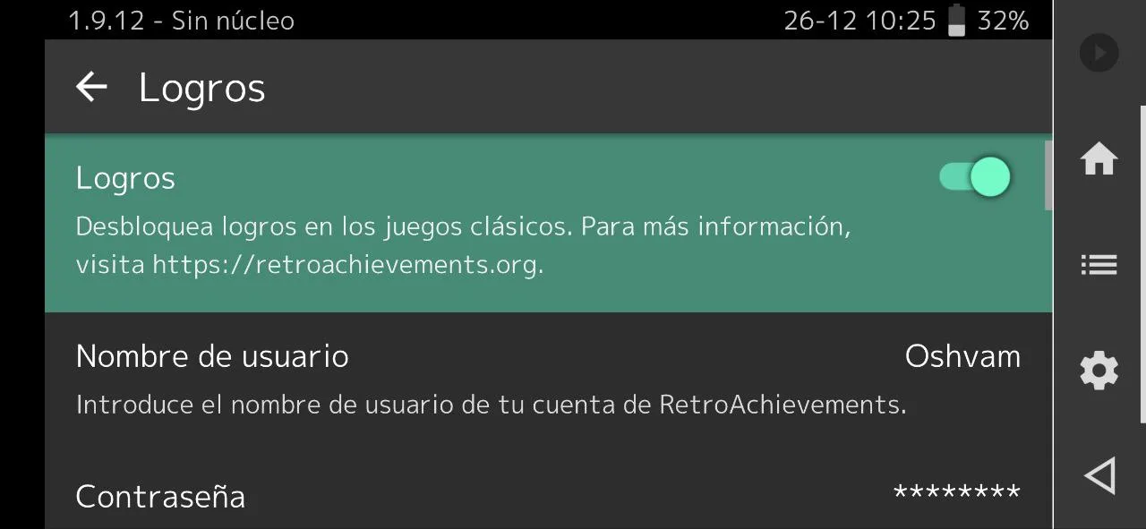 Y si, la aplicación no sirve para los logros, más adelante te explico para qué sirve realmente. Todo lo que tienes que hacer es configurar tu emulador y listo. Yo para este texto he usado RetroArch por ser el más completo y compatible de cuantos conozco. La compatibilidad de RetroArch con RetroAchievements es total y absoluta. Todo lo que hay que hacer es ir a la rueda dentada para configurar las opciones y activar los logros. Ahí te pedirá que metas usuario y contraseña, que son las credenciales de la cuenta que nos creamos en el párrafo anterior.