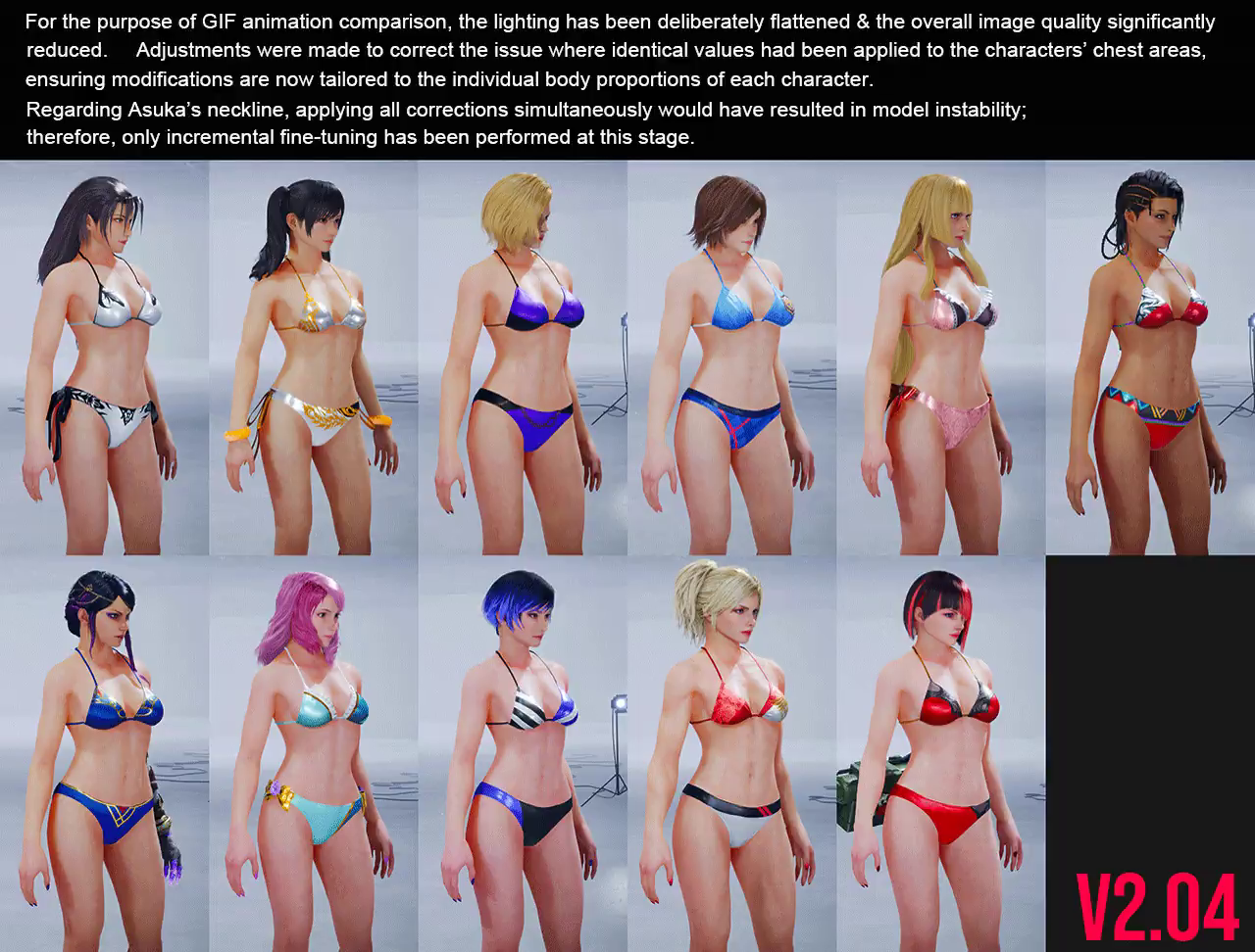 El equipo de desarrollo optó por ajustes sutiles en lugar de modificaciones drásticas. En el caso de Asuka, por ejemplo, se trabajó en detalles como los hombros, la parte superior de los brazos y el cuello para evitar problemas de estabilidad en los trajes personalizables. Harada aclaró que las diferencias son más evidentes en el entorno 3D del juego que en comparaciones estáticas, donde los cambios pueden pasar desapercibidos.